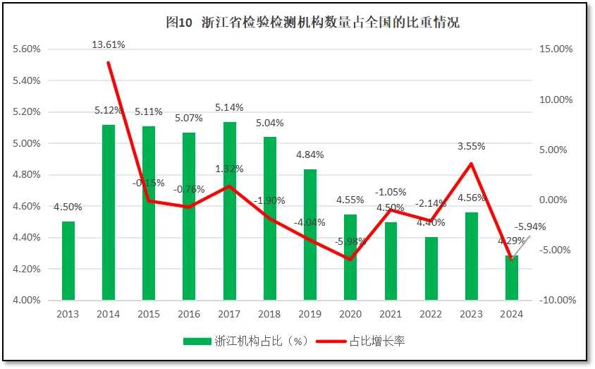 由图10可见,浙江省检验检测机构数量在全国检验检测机构总数中的占比呈现一个先增后减的发展趋势,2013-2014年,浙江省检验检测机构数量占比从4.5%增长到5.12%,此后连续三年保持在5.1%左右。从2018年起,占比逐步下降,虽然各年有所起伏,但总体呈现持续下降的趋势,2024年的占比仅有4.29%,为历年最低;同比增长率为-5.94%,是除了2020年之外第二低的一年。