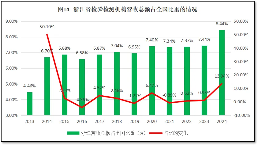 浙江省作为检验检测大省,其检验检测机构营收总额在全国检验检测行业中排名第4。2024年度,浙江省检验检测机构营收总额达到411.41亿元,占全国检验检测行业年度营业收入的8.44%。过去12年,浙江省检验检测行业年度营业收入总额在全行业中的占比情况如图14所示。