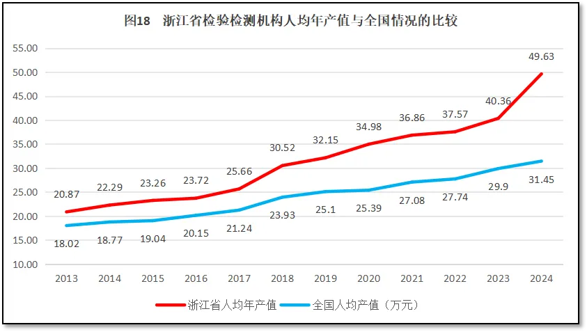 由图18可见,12年来,浙江省检验检测机构人均年产值一直比全国平均水平高,且最近几年进一步拉开了与全国平均水平的差距,2024年人均年产值比全国平均数高出近20万元,显示了浙江省检验检测机构良好的经营状况和较强的盈利能力。