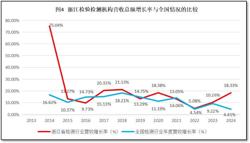 比较浙江省检验检测行业年度营收总额增长率与全国检验检测行业年度营收总额增长率,如图4所示。
